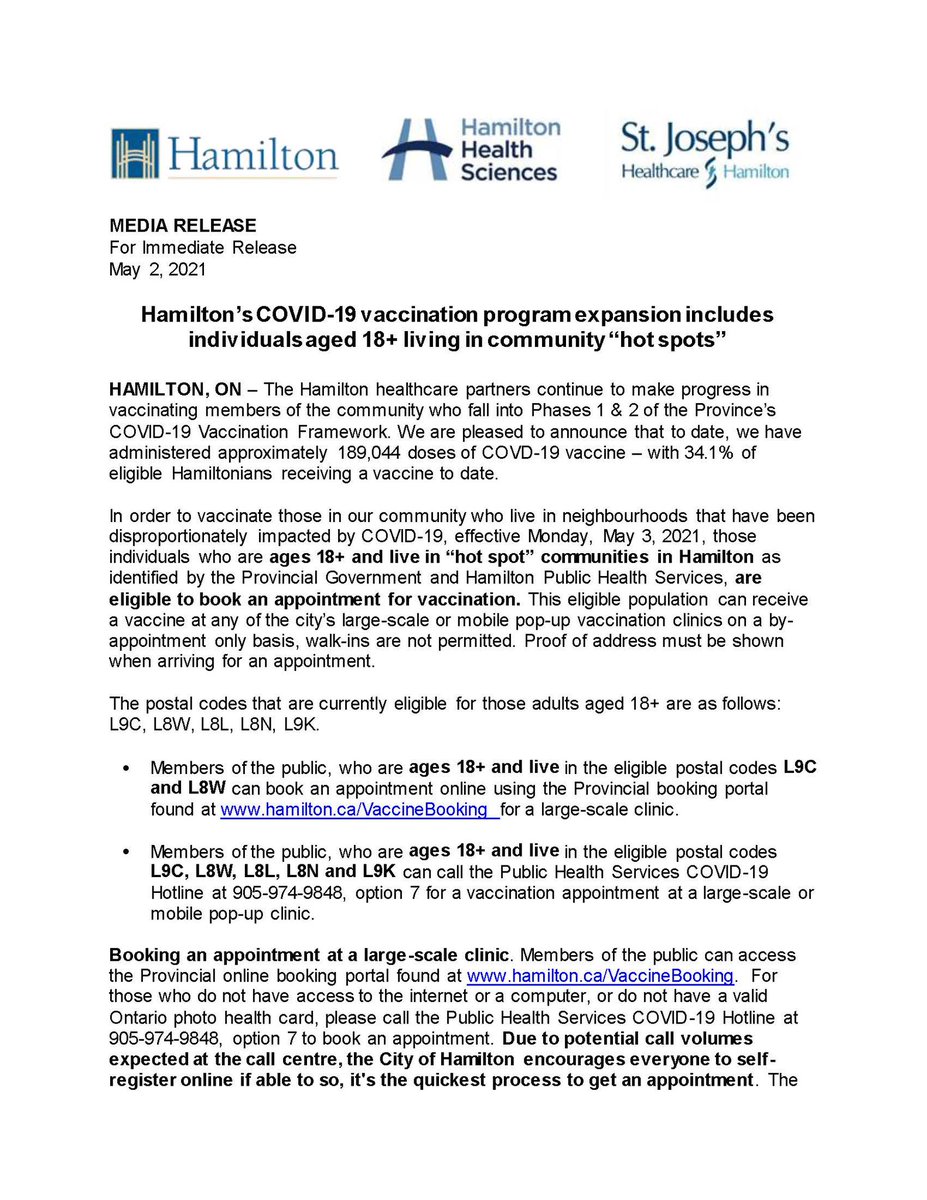 City Of Hamilton On Twitter Hamilton S Covid 19 Vaccination Program Expansion Includes Individuals Aged 18 Living In Community Hot Spots Effective May 3 Effective May 6 Anyone Turning 50 And Over In 2021