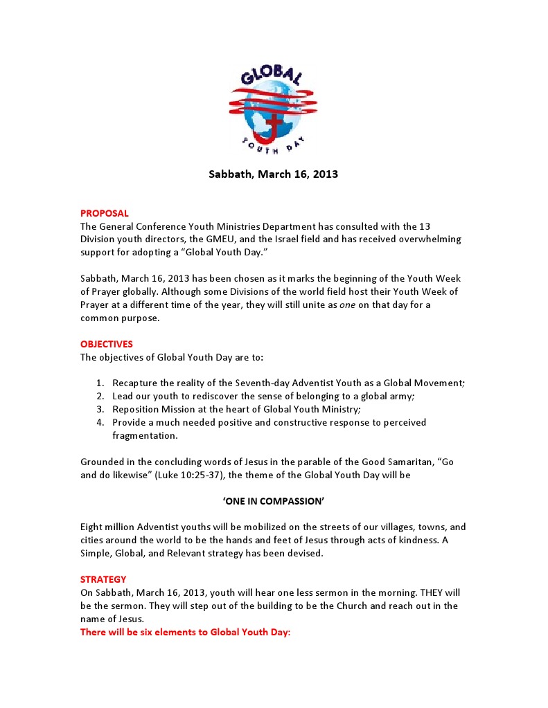 Global Youth Day Proposal And Goals Seventh Day Adventist Church Ancient Mediterranean Religions